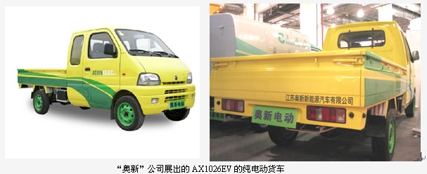 原來展覽會上的這輛“明星”貨車,出生地在江蘇鹽城,制造者為江蘇奧新新能源汽車有限公司,是一輛型號為AX1026EV的純電動貨車。據現場奧新工作人員介紹,這輛純電動貨車選用的是高性能免維護鉛酸動力蓄電池,一次充電可行駛里程約150公里,最大爬坡度為25%,最高時速可以達到95公里/每小時,能滿足各中小型城鎮、大型小區的運營需求。