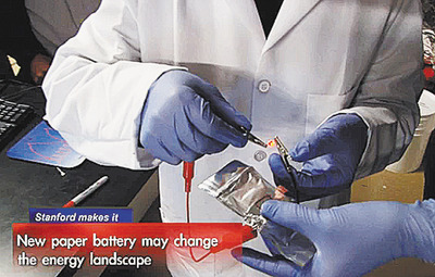 中新網(wǎng)12月9日電 據(jù)香港《文匯報》報道,普通紙張未來或許可以用做輕型電池。美國加州斯坦福大學(xué)華裔科學(xué)家崔屹(Yi Cui)參與的研究顯示,科研人員將由銀和碳納米材料制成的特殊墨水,涂在紙張上,成功制成“紙電池”,為輕型、高效的新型能源存儲帶來希望之光。