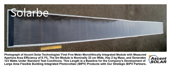 Ascent Technologies于09年6月公開的5m長32cm寬的CIGS型模塊。開口部的轉換效率為9.1%。