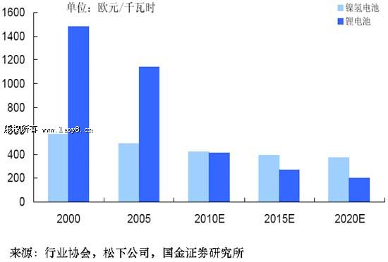 根據其分析(見圖2),雖然2010年之前鋰電池的成本高于鎳氫電池,但鋰電池的成本預計從2010年開始就將降到與鎳氫電池相當的水平,之后鋰電池的成本更將明顯低于鎳氫電池。