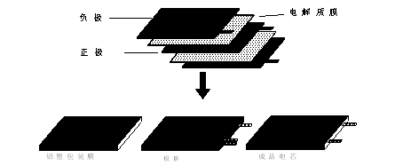 以LiCoO2為正極材料、石墨為負極材料,自制聚合物電解質膜為隔膜,1M LiPF6/EC+DMC(v/v=1:1)為電解液,組裝成聚合物鋰離子電池。電池裝配示意圖如圖1所示。