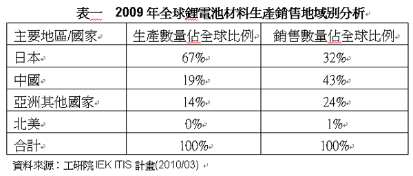 在生產與銷售地區上,在2009年仍然呈現集中于亞洲的態勢,其中日本仍為最主要的正極材料生產與銷售大國,雖然在日本國內因生產成本高漲之故,鋰電池的制造出口逐年下降中,但至今全球仍有近67%的鋰電池正極材料在日本生產,中國與其他亞洲地區僅占19%與14%。至于在銷售地區分布上,由于下游的電池大廠仍以日商為多,因此日本仍為銷售地區比例最高的國家,其他依序為中國、其他亞洲地區、北美等地。