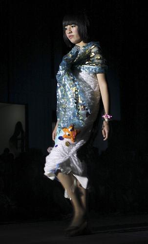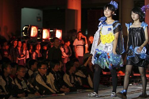 當晚,該校105名學生“模特”展示了用廢光盤、塑料袋、廢舊磁帶、一次性桌布等材料自制的“環保時裝”。
