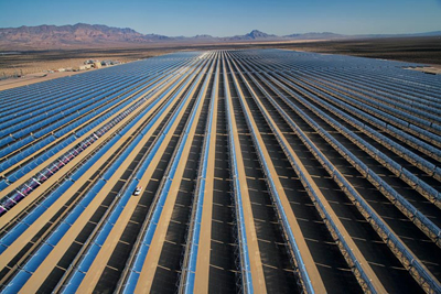 集中式太陽能在拉斯維加斯附近內(nèi)華達(dá)州的一個太陽能場,管道般長排下來的反射鏡片吸收了太陽光聚焦,轉(zhuǎn)化足夠的熱量生產(chǎn)蒸汽驅(qū)動一個64兆瓦的發(fā)電廠。公用事業(yè)很支持這樣的系統(tǒng),也稱為太陽熱能,比光伏太陽能昂貴。