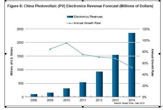 隨著政府補貼計劃在2010年達到頂點,光伏電子市場也將同時觸頂。盡管預計接下來三年年增長率下降——除非出臺新的政策,但該市場將繼續保持一定的勢頭,足以在2014年實現24億美元的銷售收入。