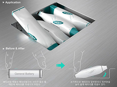 猜猜看,這是什么?——小A第一眼看到時還以為是支記號筆!絕不會有人想到這居然會是電池,因為它的造型實在太怪異了!其實,在拉風的外表之下這樣的設計卻有著樸素的目的:我們經常遇到這種尷尬的情況,鬧鐘、光電鼠標、遙控器中的電池需要更換了,可是怎么取也取不出來,那樣的方寸之地,有力氣也不知道怎么使,尤其對于那些不留指甲的人更是苦惱。(雙刀BT貓亂入:小A桑,有指甲會更痛苦的……我就曾經用指甲去摳電池,電池沒出來,指甲翻過來了……那個疼--)