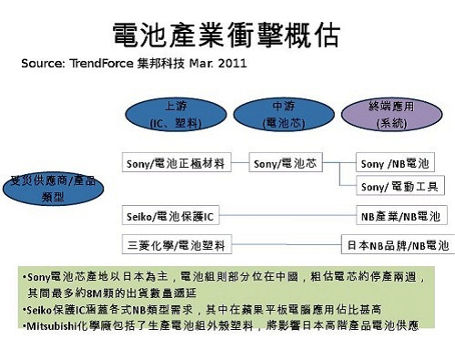 對于電池產業來說,無論上游至終端,都有所影響,從最上游原料來看,包括了三菱化學以及Seiko都在名單當中,三菱化學所生產的電池正極粉體,主要仍以 NB為大宗,使用終端以日本NB產品為主;Seiko生產電池保護IC,幾家NB品牌廠都有所采用,尤其在Apple新款平板計算機的應用更是獨占,后續補料狀況 將值得觀察。