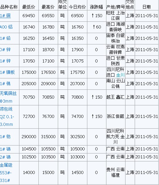 - 2011年5月31日沈陽(yáng)有色金屬市場(chǎng)行情
