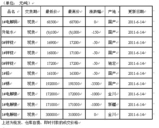 2011年6月14日廣東有色現貨報價(南儲)(銅鋁鉛鋅鎳鈷鎘錳鎂鉍)