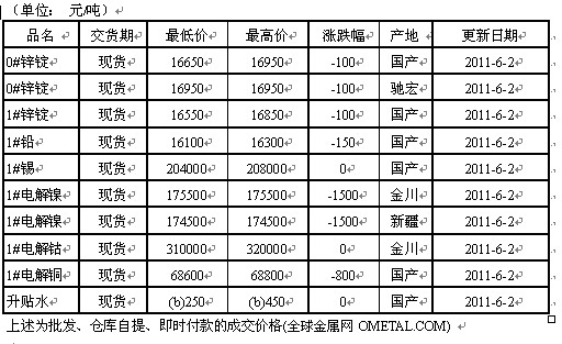 2011年6月2日廣東有色現(xiàn)貨報(bào)價(jià)(南儲(chǔ)(銅鋁鉛鋅鎳鈷鎘錳鎂鉍)