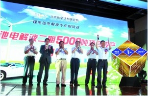 北京化學試劑研究所鋰電池電解液5000噸項目投產慶典日前在北京舉辦。該項目生產的鋰離子電池電解液可用于各種類型的鋰離子電池,廣泛應用于電動汽車、電動工具等制造領域。圖為啟動儀式上,北京化工集團公司總經理劉文超(右一)宣布5000噸鋰離子電池電解液項目正式投產。