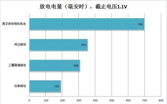 在放電到1.1V時,四位的先后順序沒有變化,但是差距變小了一些,南孚數碼相機電池的電量比第二名多一倍。白象電池落后已經不那么明顯了。