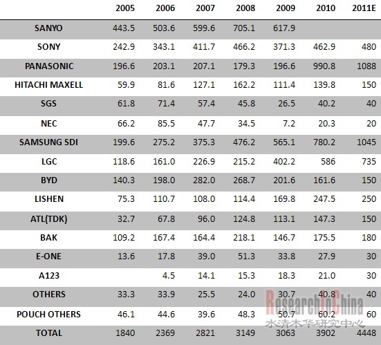 2005-2011年全球主要鋰電池廠家出貨量(單位:百萬(wàn)單元)