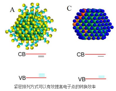 到目前為止,所有的量子點都是封鎖在有機(jī)分子中。為了解決電子的長距離移動問題,科學(xué)家利用了無機(jī)配體和比納米還要小的原子將量子點結(jié)合起來。密堆積的排列方式和負(fù)電荷捕捉器的去除確保電子能夠在太陽電池中快速和順利的移動,提供轉(zhuǎn)換效率。