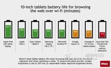 在參與測試的7款10英寸類的平板中,使用Wi-Fi瀏覽網(wǎng)頁時(shí)配備Retina顯示屏的iPad排名最前,續(xù)航時(shí)間達(dá)到811分鐘;iPad2排名第二,續(xù)航時(shí)間為590分鐘。相比之下Samsung Galaxy Tab2 10.1的續(xù)航時(shí)間為532分鐘,微軟Surface RT為501分鐘;華碩EeePad Transformer Prime是續(xù)航時(shí)間最短的,僅有335分鐘。