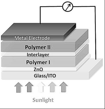 在實際研究中,為實現更有效利用太陽輻射的目的,楊陽所領導的研究小組將具有光譜吸收互補性的多片感光層組合起來,構成了串聯高分子光伏電池。他們的串聯結構包括具有較高光譜帶寬的前電池和具有較低光譜帶寬的后電池,兩電池用專門的夾層相連。