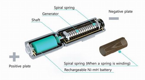 設計師Hwang Yeon Gyeong等人在電池內裝置了一套類似發條的發電系統,當電量告罄時,扭動電池上半身,上足發條,松開手后發條就能帶動發電系統較長時間運作發電,無需充電器或購買新的電池。