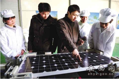 3月24日,岳西縣技術(shù)人員正在檢測剛剛下線的太陽能電池板。當(dāng)日,該縣泉源盛公司年產(chǎn)6兆瓦太陽能電池板生產(chǎn)線正式投產(chǎn),主要為公園地?zé)艏奥窡襞涮,產(chǎn)口出口歐美等國家。