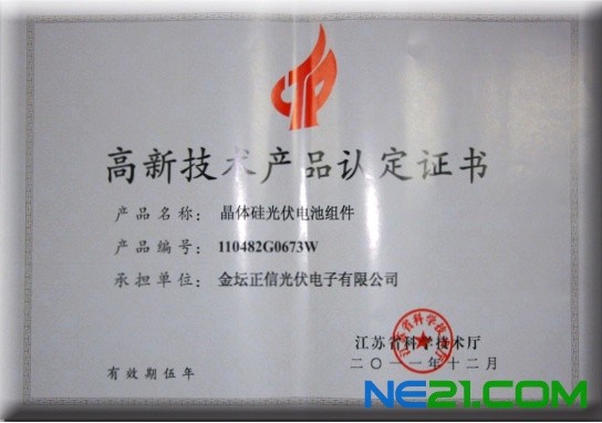 據了解,經江蘇省科技廳組成的高新技術企業認定管理工作領小組的綜合評審,江蘇正信集團晶體硅太陽能電池組件被認定為“高新技術產品”,并授予“江蘇省高新技術企業”榮譽稱號。標志著正信科技創新水平達到了新高度,同時也是對正信堅持自主創新,為國家高新技術產業發展做出突出成績的肯定。