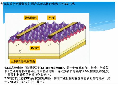 SE高效電池(選擇極發(fā)射SelectiveEmitter)是一種在現(xiàn)有加工制造工藝設(shè)備和P型硅片原料的基礎(chǔ)上的單晶硅電池。其轉(zhuǎn)化效率平均達(dá)到17.5%,性能更穩(wěn)定,受主要原材料硅片的材質(zhì)變化影響小。